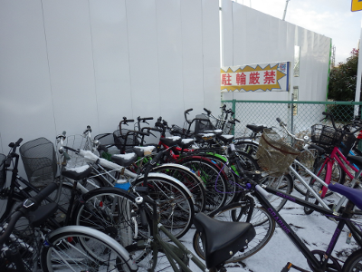 点字ブロックの上に置かれた自転車の中には,この日も,宮城野高校のステッカーが貼られた自転車があった。
