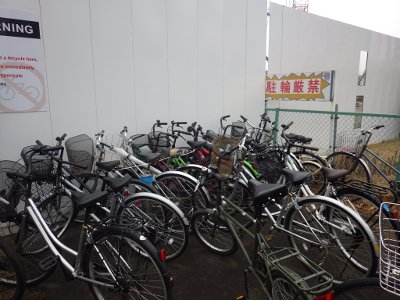 紐で結ばれた自転車は,一向に,撤去される気配はない。壁に貼られた警告は,いつになったら,実施されるのだろうか。