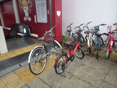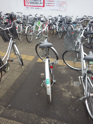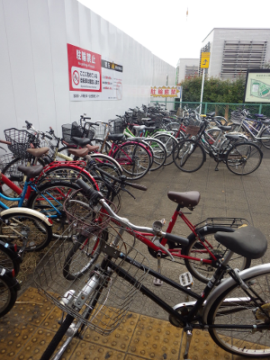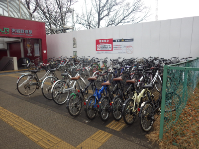 所用のためで,いつもより1時間遅く宮城野原駅前に着いたこの日,駅前に違法駐輪された自転車の数は,いつもより多かった。私の普段の出勤時間以降にここに駐輪している自転車が少なからずあるのかもしれない。道路側の点字ブロックの上に置かれた自転車の数は,いつもと同程度である。