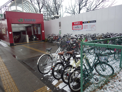 街がうっすらと雪化粧したこの日,宮城野原駅前に違法駐輪された自転車の数は,いつもより少なかった。点字ブロックの上に駐輪された自転車の数も,いつもの半分程度だ。
