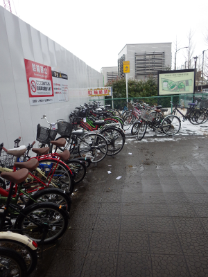 サドルに雪が積もっている自転車のハンドル部を見ると,下げ札がつけられている。近寄ってみると,ここは駐輪禁止であること,2/13にバリケード封鎖することなどが書かれている。ようやく,管理者たちが本腰を入れて動き出したようだ。