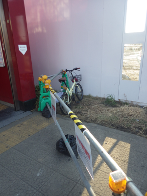 バリケードの中には,駅入口側に1台,自転車が停められていた。この自転車は,バリケード封鎖以前から,この駅前によく駐輪していた自転車である。このような自転車に対して,警告書を貼り付けるなどの対処を早急にしないと,このバリケードの中に自転車を置くものが,続出する可能性があることを指摘しておこう。