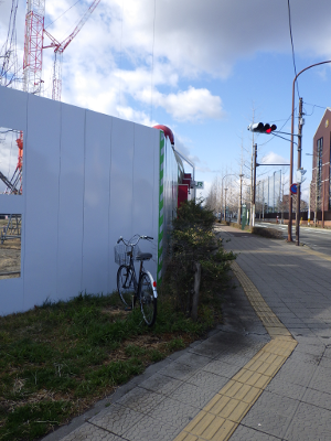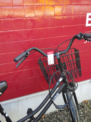 駅舎横に停められた自転車は,前日から放置されたままのようで(前夜帰る時にも置かれていた),そのハンドルには,早速,違法駐輪をやめるよう求めるタグが貼られていた。素早い対応だ。このような対応をしても,違法駐輪をやめないようであれば,できるだけ迅速に撤去すべきであろう。新学期が始まる前に,この位置への違法駐輪は,完全にない状態にする必要があるからだ。