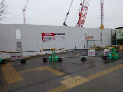 冷たい雨が降るこの日,宮城野原駅前に違法駐輪された自転車は,歩道に停められた1台であった。点字ブロックの上に停められた自転車はない。