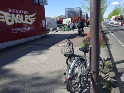 ゴールデンウィーク中の平日2日目であるこの日,宮城野原駅前に違法駐輪された自転車は,駅前の歩道の車道側に置かれた2台であった。点字ブロックの利用に邪魔になる位置に置かれた自転車はなかった。