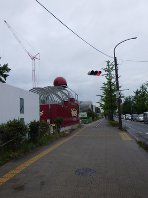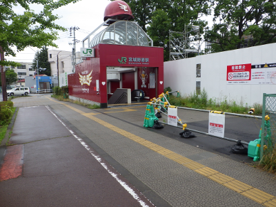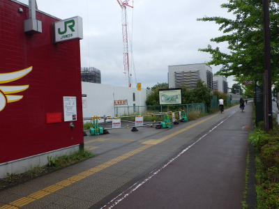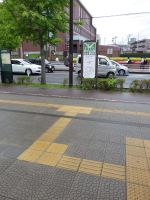 私の出勤時には雨があがっていたものの天気が悪いこの日,宮城野原駅前の歩道に違法駐輪された自転車はなかった。点字ブロックの利用に支障をきたすような妨害物はない。