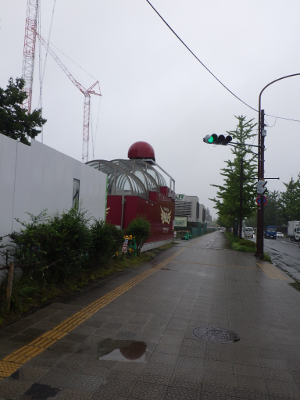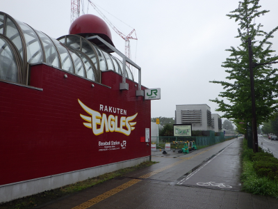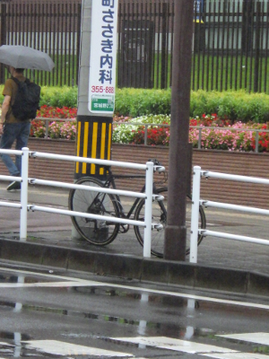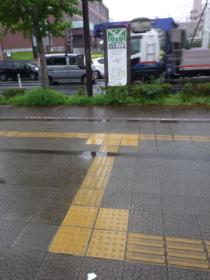 小雨が降るこの日,宮城野原駅の球場側付近には,違法駐輪された自転車はなかった。点字ブロックの障害となるものはない。