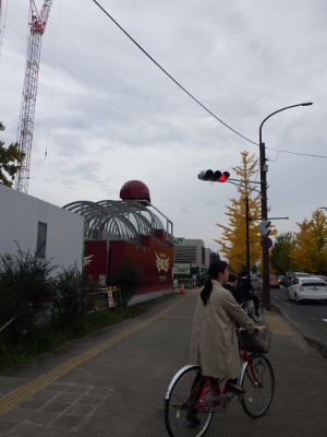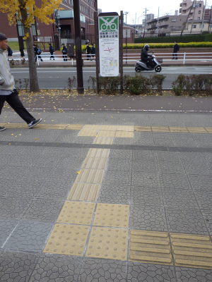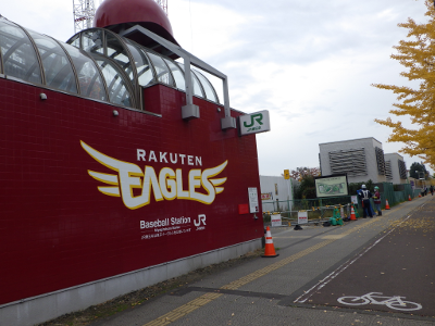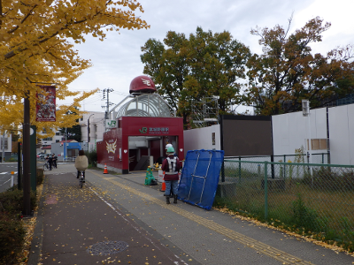 この日は,球場側の駅舎前に,工事関係と思われる警備員2名が立っていた。このあたりでも,何か,作業が始まるのだろうか。作業を行う場合は,点字ブロック者の通行に支障がないように配慮願いたい。