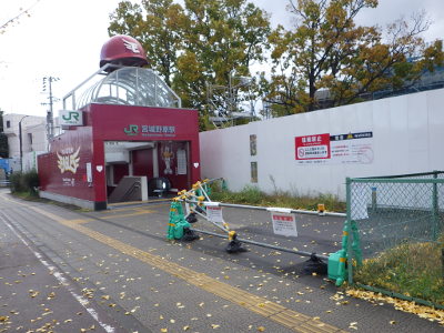 小雨がぱらついていた土曜の朝であるこの日,宮城野原駅前に違法駐輪された自転車はなかった。点字ブロック利用の支障となるような障害物もなかった。