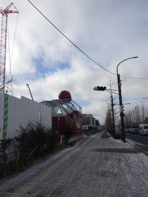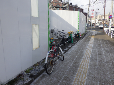 仙台医療センターの新築工事現場脇の旧ベンチの周りには,昨年末から放置された2台の自転車が,未だ放置されっぱなしになっている。そして,バリケードの手前側に,1台の自転車が違法駐輪されていた。この自転車の持ち主は,違法駐輪の常習犯だ。この場所に1台だけ駐輪されている分には,点字ブロックの使用の大きな支障にはならないが,真似をする自転車が増えてくると,確実に点字ブロック利用の邪魔になる。そうなる前に,早急な撤去が必要だ。