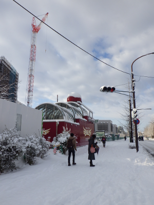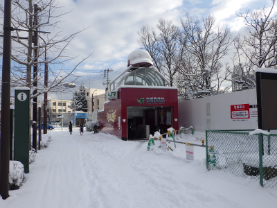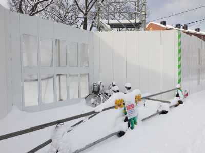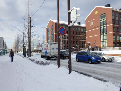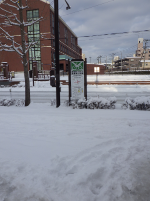 雪が積もったこの日,宮城野原駅前の交差点のところには,違法駐輪された自転車はなかった。点字ブロックは雪に埋もれて,使用できなかった。