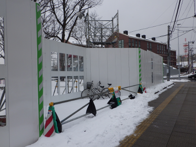 雪が積もったこの日,宮城野原駅の球場側の駅舎前には,