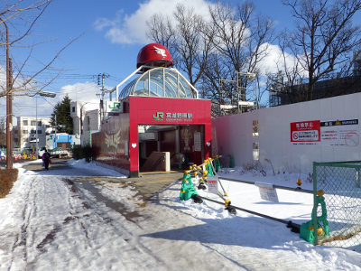 点字ブロックは,駅の敷地内は雪かきされて使えるようになっていたが,歩道側に出ると,まだ雪に埋もれていて,使用できなかった。