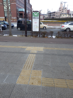 宮城野原駅前に仙台市委嘱の自転車誘導員が立つこの日,駅前の球場側の駅舎周辺には,違法駐輪された自転車はなかった。点字ブロックは,ごく一部雪が残っていたが,概ね使用できる状態であった。。