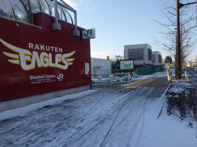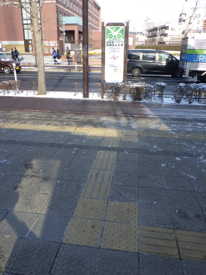 宮城野原駅前に仙台市委嘱の自転車誘導員が立つこの日,駅前の球場側に違法駐輪された自転車はなかった。点字ブロックの利用を妨げるような障害物もなかった。
