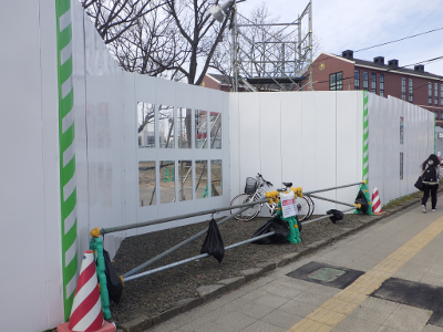 仙台医療センターの新築工事現場脇の旧ベンチの周りには,昨年末から放置された2台の自転車が,未だ放置されっぱなしになっていた。しかし,移設されたベンチの移設先である休憩場所には,違法駐輪された自転車はなかった。また,交差点角の空き地にも,違法駐輪された自転車はなかった。