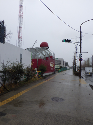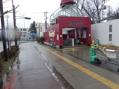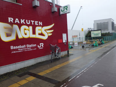 激しい雨が降るこの日も,宮城野原駅の球場側の駅舎前に,