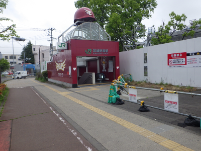 曇天のこの日,宮城野原駅前に違法駐輪された自転車はなかった。また,点字ブロックの利用を妨げるような障害物はなかった。