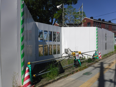 また,移設されたベンチの移設先である休憩場所に,警備員が集合しており,そのうちの誰かのものと思われる自転車が1台駐輪されていた。この自転車が警備員のものであり,解散後すぐに警備員と共に撤収されるのであれば問題ないが,そのまま放置されたら,工事関係者自ら違法駐輪を犯すという点で,極めて大きな問題であることを指摘しておこう。