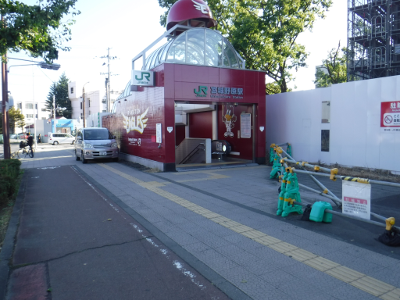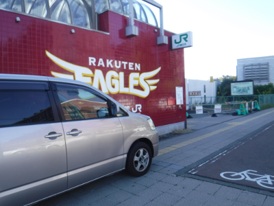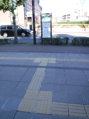 よく晴れたこの日,宮城野原駅前に違法駐輪された自転車はなかった。しかし,よりによって,点字ブロックの上に駐車する車があり,点字ブロックの利用はできなかった。