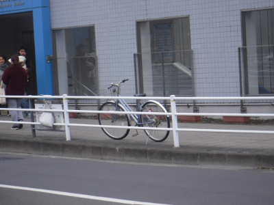と同一のものと思われる。逆側の歩道側からだと正確には判断できないが,この位置の違法駐輪は,視覚障害者の点字ブロック利用の支障となる恐れがある。管理者には早急な対応をお願いしたい。