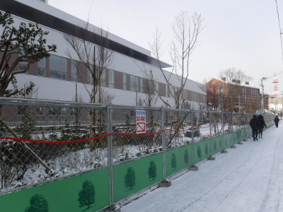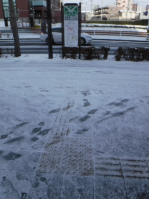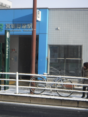 昨夜からの雪が積もったこの日,仙台医療センターの新築工事側の宮城野原駅前に違法駐輪された自転車はなかった。また,点字ブロックの利用に支障をきたすような妨害物もなかった。