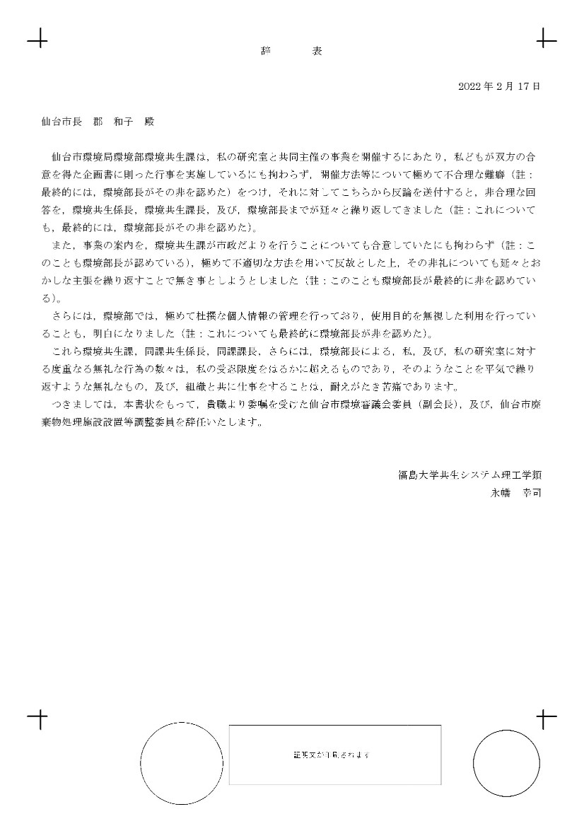 仙台市環境局環境部(特に環境共生課環境共生係)の度重なる極めて無礼な行為について,さすがに腹に据えかねたので,仙台市長宛に仙台市環境審議会委員(副会長)及び仙台市廃棄物処理施設設置等調整委員の辞表を提出しました。 (2022/2/17)