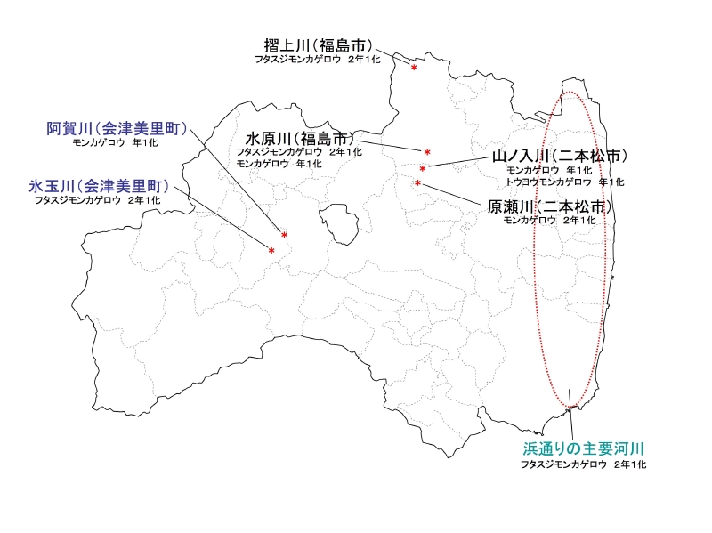 - 遠藤絢香(2007)福島県浜通り地方におけるフタスジモンカゲロウの生活史,