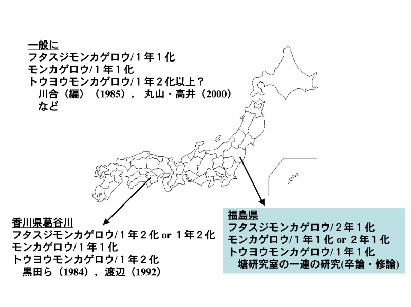 - 斎藤広行・塘 忠顕(2009)福島県会津美里町(会津地方)におけるモンカゲロウ Ephemera strigata Eatonの生活史(カゲロウ目:モンカゲロウ科) ー福島県二本松市(中通り地方)における生活史との比較ー,