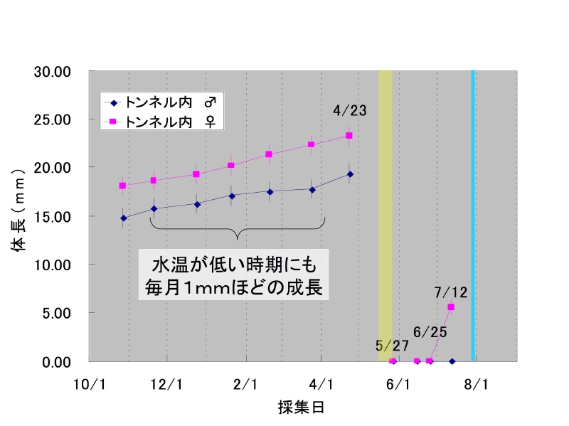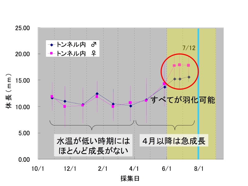 モンカゲロウの生活史/青いラインはダム湖からの試験放水期間,黄色いラインは羽化期間を示している。山ノ入川に生息しているモンカゲロウは,5月中旬から6月下旬までが羽化時期で,1年1化です。トンネルの内外で成長速度に差があり,それは餌としてるデトリタスの差が原因である可能性が高いと思われます。トンネル外に生息する幼虫の中には羽化までに1年以上を要する個体も存在するようです。