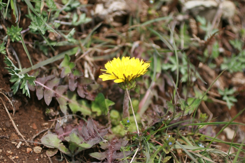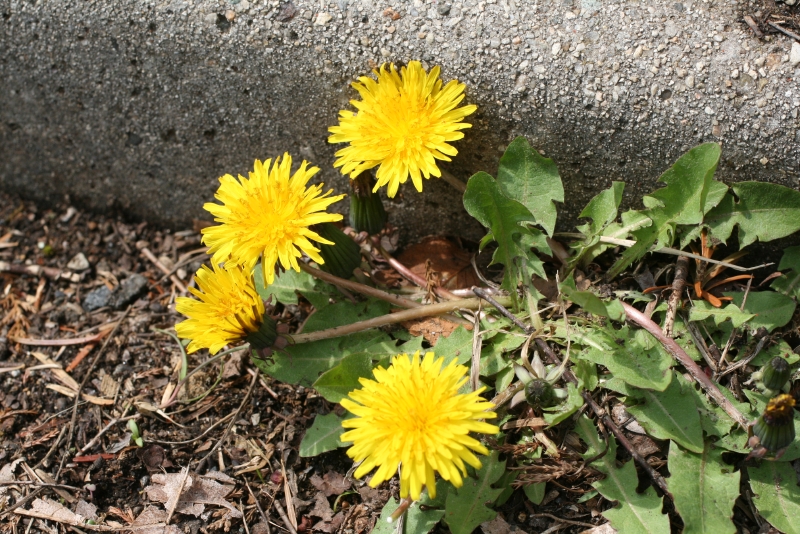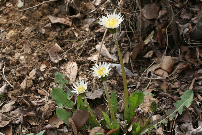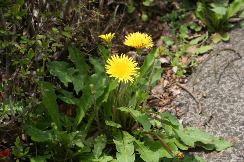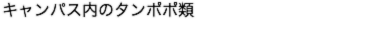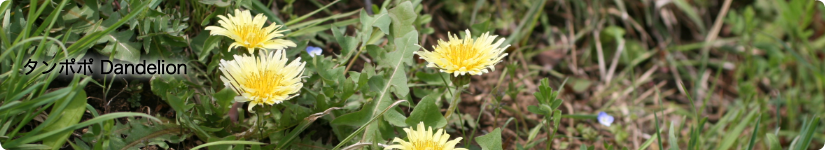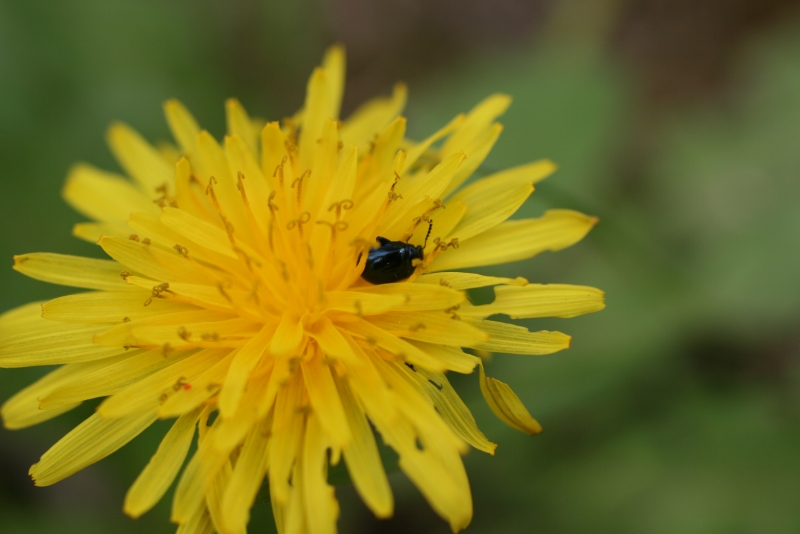 福島大学キャンパス内のタンポポ類を紹介しましょう。春のみに開花する在来種の中では黄色いエゾタンポポがもっとも多く,次いで花がちょっと白っぽいオクウスギタンポポ,さらに花が白いシロバナタンポポはS棟前の植え込みの中にしか見られません。年中花を咲かせ,総包が反り返る外来種は2系統,実が赤褐色のアカミタンポポと灰褐色のセイヨウタンポポが見られます。上の写真はエゾタンポポの花弁を食べた後,休憩中のルリマルノミハムシです。
