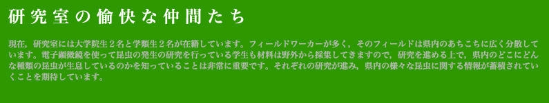 卒業研究ではいわき市田人にある森林再生に伴う生物多様性調査地(植林されたスギが伐採された後にコナラとクヌギを植林した場所)で,雑木林ができる初期状態での昆虫相を調査しましたが,大学院では穿孔亜目のアザミウマ類の卵膜の微細構造の観察,そして未発見の卵門の探索を透過型電子顕微鏡や走査型電子顕微鏡を駆使して行っています。