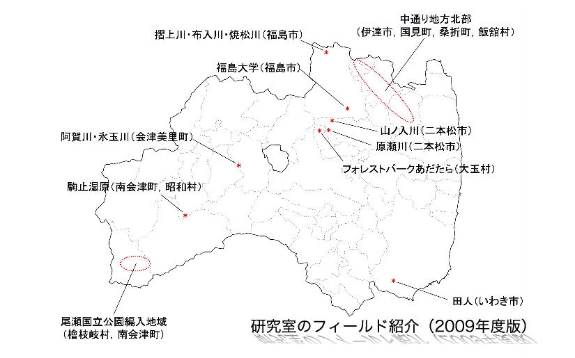 卒業研究ではフィールドワークを主としてきた学生は,毎年12月中旬にふくしま県民の森「フォレストパークあだたら」で開催される「生き物調査発表会」で,卒業研究の発表を行っています。この発表会には学外の研究者こそ参加していませんが,県内各地でエコリーダーや森の案内人として活躍されている方が参加され,学生たちの発表にアドバイスやサジェスチョンを下さいます。2007年と2008年は塘研究室と黒沢研だけの参加でしたが,2009年からは難波研も参加するようになりました。