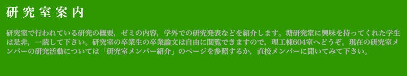 ゼミなどの内容研究室のゼミは毎週月曜5時限目です 塘研究室は共生システム理工学類棟(理工棟)6階の605室が教員研究室,604室が学生のメイン・ラボ,618室がサブ・サボ(研究機器が設置されている部屋)になっています。通常,研究室のメンバーは604室か618室で研究を行っていますが,ゼミは理工310演習室(理工棟3F)で行われています。ゼミは研究室配属が決まった3年生,そして4年生,院生と教員が参加します。ちなみに,教育実習などで参加学生が少なくなっても,教員一人だけにならない限りゼミは開かれます。教育学部時代は学生と先生がマン・ツー・マンでゼミ,なんてことも珍しくありませんでした(が今では考えられません・・・)。 |