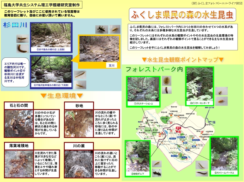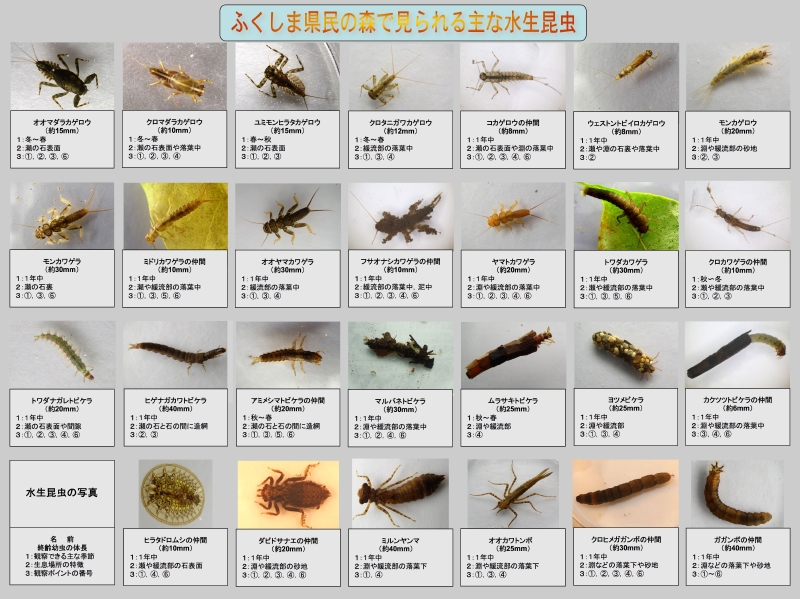 ふくしま県民の森内を流れる川で観察できる代表的な水生昆虫27種類を紹介しています。